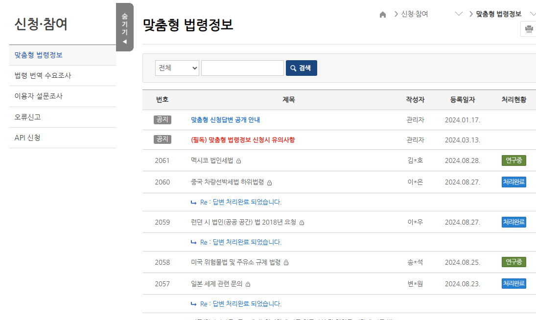 또한 찾고 있는 법이 없거나, 정확한 법명을 모른다면 이렇게 문의로 남겨 요청할 수 있다.