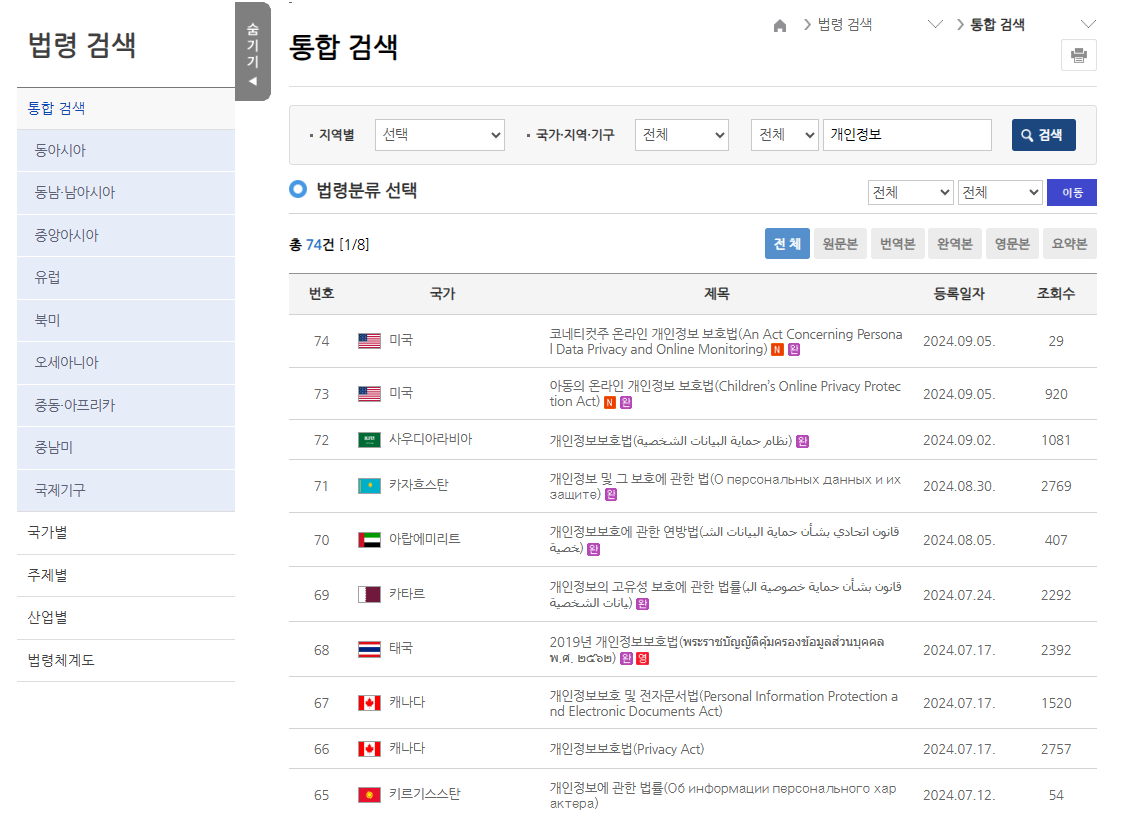 전 세계의 법을 원문, 번역본으로 제공해준다. 검색을 통해 개인정보만 따로 보면 쉬움