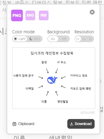 만든 이미지는 PNG, SVG, PDF로 저장 가능하고, 클립보드 복사로 편하게 바로 붙여넣을 수 있어요!