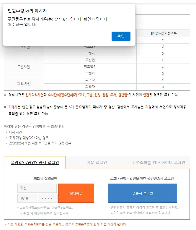 이후 본인이 입력한 개인정보를 토대로 사건조회가 만들어진다고 합니다.