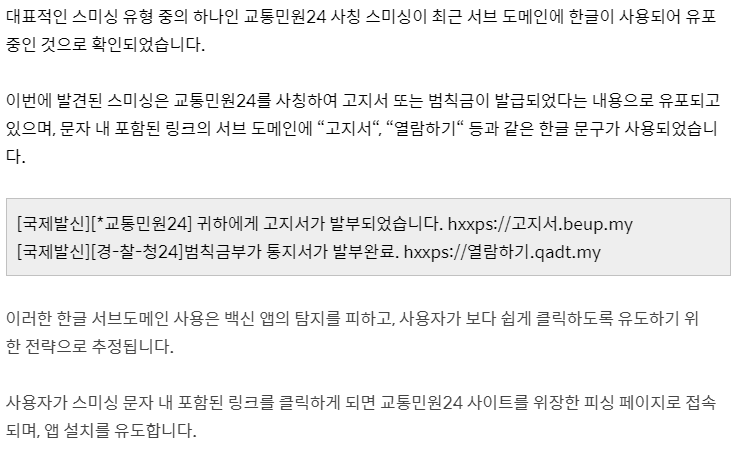 대표적인 스미싱 유형 중의 하나인 교통민원24 사칭 스미싱이 최근 서브 도메인에 한글이 사용되어 유포 중인 것으로 확인되었습니다. 이번에 발견된 스미싱은 교통민원24를 사칭하여 고지서 또
