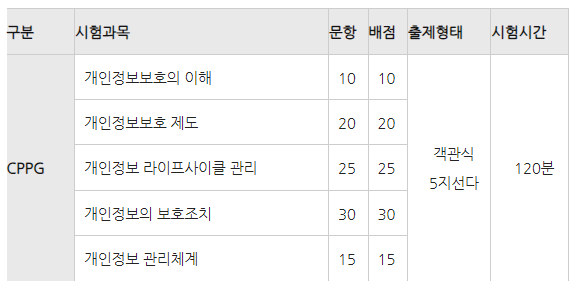 | 3. 개인정보 라이프사이클 관리(25%) | 1. 개인정보 수집, 이용 - 개인정보 오너십의 이해 - 개인정보 수집, 이용 원칙 - 개인정보 수집, 이용 시 유의사항 2. 개인정보 저장, 관리 - 개인정보 저장, 관리의 이해 - 개인정보 파기의 원칙 - 개인정보 처리 시 유의 사항 3. 개인정보 제공 - 개인정보 제공의 이해 - 개인정보 제3자 제공, 위탁 원칙 - 제3자 제공과 위탁의 구분 - 개인정보 제공 시 유의사항 |