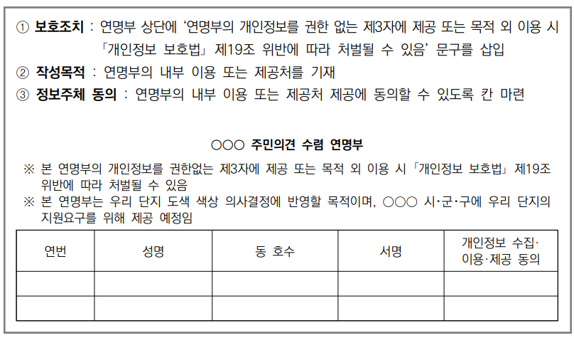 - 공동주택 입주민의 찬반투표 연명부를 제시하거나, 서명을 받는것은 의견에 대한 입주민의 개인정보를 수집 ·이용 ·제공하는 것이므로 이에 대한 개인정보 수집 ·이용 ·제공 동의란을 만들어 입주민이 동의를 표시하도록 해야함